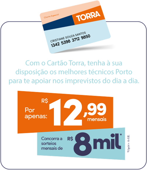A PORTO ASSISTENCIA PARTICIPACOES S.A., aqui denominada Promotora, inscrita no CNPJ sob o n° 46.559.987/0001-80, é subscritora de títulos de capitalização, da modalidade incentivo, administrados pela ICATU CAPITALIZAÇÃO S/A, aqui denominada ICATUCAP, inscrita no CNPJ sob o no 74.267.170/0001-73, cujas condições gerais e suas notas técnicas foram aprovadas pela Superintendência de Seguros Privados – SUSEP, conforme processo(s) no(s) 15414.900401/2019-95. Ao contratar o Assistência Auto24h, a Promotora cederá, gratuitamente, o direito de participação no sorteio vinculado a um dos títulos subscritos para o Cliente que preencher as condições estabelecidas neste regulamento. O Cliente participará de 01 (um) sorteio mensal, durante o período de vigência, no valor líquido de R$ 8.000,00 (oito mil reais), sobre o qual incidiu 25% (vinte e cinco por cento) de Imposto de Renda, conforme legislação vigente. Período da Promoção: Indeterminado. Para mais informações sobre sorteio, consulte previamente as Condições Gerais e as características essenciais em https://www.gov.br/pt-br/servicos/consultar-produtos-susep. Acesse o Regulamento em https://www.cartaotorra.com.br/servicos/assistencia-auto/. SAC PORTO ASSISTENCIA 0800 008 9772. SAC ICATU 0800 286 0047 (atendimento exclusivo de informações relativas ao sorteio de capitalização). Ouvidoria ICATU 0800 286 0047 (tenha em mãos o protocolo do atendimento do SAC Icatu).