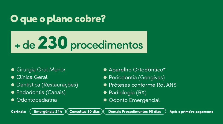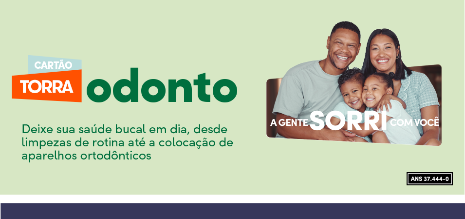 Produto garantido pela PREVIDENT ASSISTÊNCIA ODONTOLOGICA SA. inscrita no CNPJ/ME sob o no 56.269.913/0001-62 e registrada na ANS sob o no 37.444-0 e no CROSP sob no 4.559. (1) Consultar a disponibilidade do procedimento no Torra Odonto. https://www.torraodonto.com.br/. Não cobertas próteses de porcelana, pontes fixas ou removíveis, próteses totais, próteses parciais removíveis e próteses para fins estéticos. Somente Próteses do Rol da ANS. Este conteúdo contém informações resumidas que poderão sofrer alterações sem aviso prévio. O plano obedece as Condições Gerais, que devem ser lidas previamente á sua contratação. Consulte as condições Gerais do Plano Odontológico. Plano - Referência - Registro ANS: 700.827/99-9 *Incluso apenas a colocação do aparelho.
